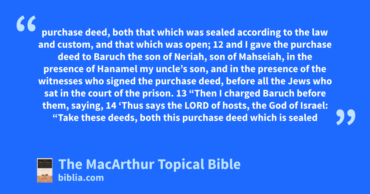 purchase deed, both that which was sealed according to the law and custom, and that which was open; 12 and I gave the purchase deed to Baruch the son of Neriah, son of Mahseiah, in the presence of Hanamel my uncle’s son, and in the presence of the witnesses who signed the purchase deed, before all the Jews who sat in the court of the prison. 13 “Then I charged Baruch before them, saying, 14 ‘Thus says the LORD of hosts, the God of Israel: “Take these deeds, both this purchase deed which is sealed