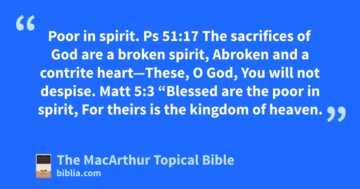 Poor in spirit. Ps 51:17 The sacrifices of God are a broken spirit, Abroken and a contrite heart—These, O God, You will not despise. Matt 5:3 “Blessed are the poor in spirit, For theirs is the kingdom of heaven.