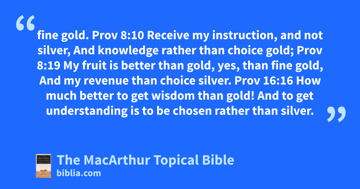 fine gold. Prov 8:10 Receive my instruction, and not silver, And knowledge rather than choice gold; Prov 8:19 My fruit is better than gold, yes, than fine gold, And my revenue than choice silver. Prov 16:16 How much better to get wisdom than gold! And to get understanding is to be chosen rather than silver.