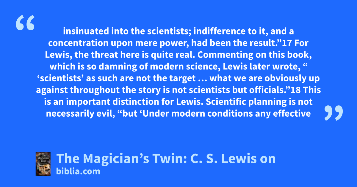 insinuated into the scientists; indifference to it, and a concentration upon mere power, had been the result.”17 For Lewis, the threat here is quite real. Commenting on this book, which is so damning of modern science, Lewis later wrote, “ ‘scientists’ as such are not the target … what we are obviously up against throughout the story is not scientists but officials.”18 This is an important distinction for Lewis. Scientific planning is not necessarily evil, “but ‘Under modern conditions any effective