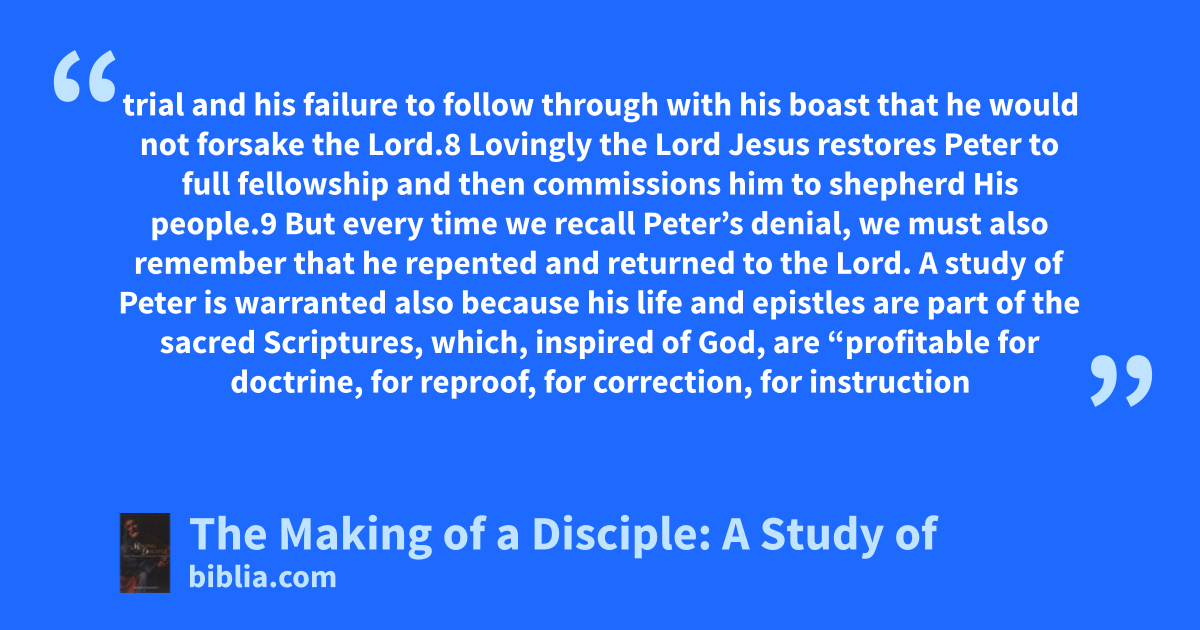 trial and his failure to follow through with his boast that he would not forsake the Lord.8 Lovingly the Lord Jesus restores Peter to full fellowship and then commissions him to shepherd His people.9 But every time we recall Peter’s denial, we must also remember that he repented and returned to the Lord. A study of Peter is warranted also because his life and epistles are part of the sacred Scriptures, which, inspired of God, are “profitable for doctrine, for reproof, for correction, for instruction