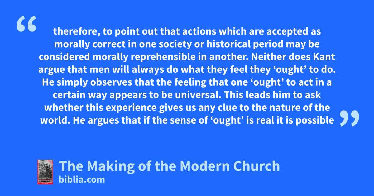 therefore, to point out that actions which are accepted as morally correct in one society or historical period may be considered morally reprehensible in another. Neither does Kant argue that men will always do what they feel they ‘ought’ to do. He simply observes that the feeling that one ‘ought’ to act in a certain way appears to be universal. This leads him to ask whether this experience gives us any clue to the nature of the world. He argues that if the sense of ‘ought’ is real it is possible