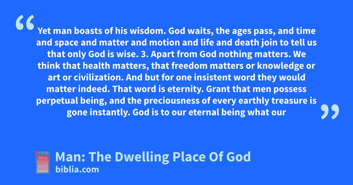 Yet man boasts of his wisdom. God waits, the ages pass, and time and space and matter and motion and life and death join to tell us that only God is wise. 3. Apart from God nothing matters. We think that health matters, that freedom matters or knowledge or art or civilization. And but for one insistent word they would matter indeed. That word is eternity. Grant that men possess perpetual being, and the preciousness of every earthly treasure is gone instantly. God is to our eternal being what our