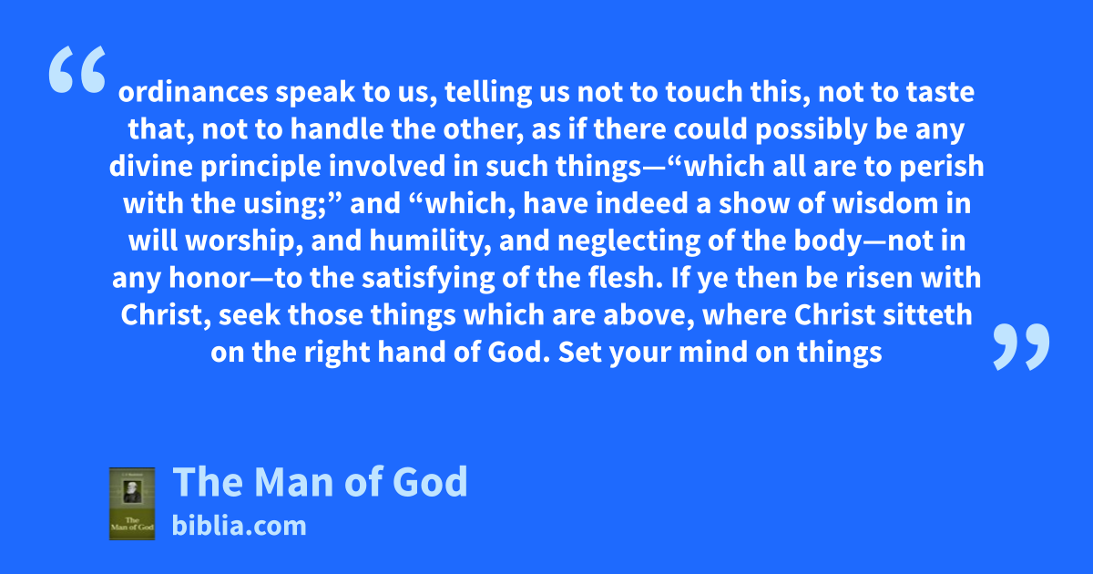 ordinances speak to us, telling us not to touch this, not to taste that, not to handle the other, as if there could possibly be any divine principle involved in such things—“which all are to perish with the using;” and “which, have indeed a show of wisdom in will worship, and humility, and neglecting of the body—not in any honor—to the satisfying of the flesh. If ye then be risen with Christ, seek those things which are above, where Christ sitteth on the right hand of God. Set your mind on things