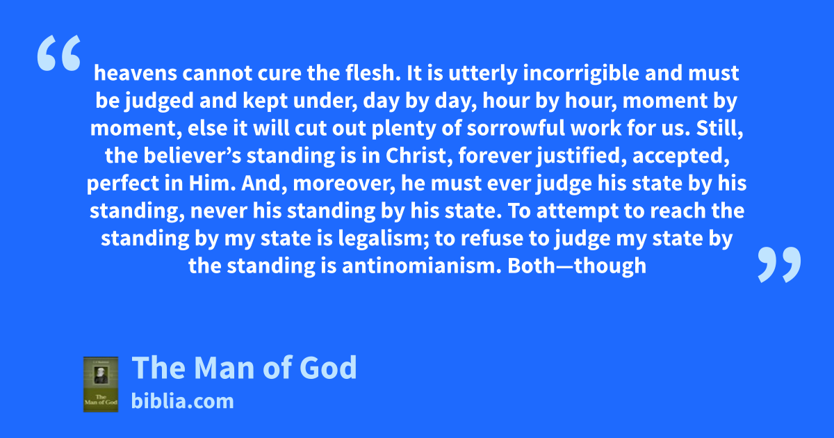 heavens cannot cure the flesh. It is utterly incorrigible and must be judged and kept under, day by day, hour by hour, moment by moment, else it will cut out plenty of sorrowful work for us. Still, the believer’s standing is in Christ, forever justified, accepted, perfect in Him. And, moreover, he must ever judge his state by his standing, never his standing by his state. To attempt to reach the standing by my state is legalism; to refuse to judge my state by the standing is antinomianism. Both—though