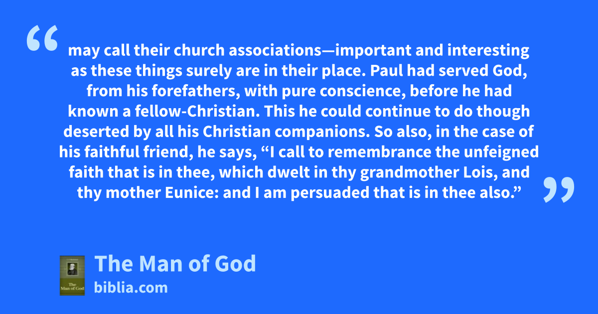 may call their church associations—important and interesting as these things surely are in their place. Paul had served God, from his forefathers, with pure conscience, before he had known a fellow-Christian. This he could continue to do though deserted by all his Christian companions. So also, in the case of his faithful friend, he says, “I call to remembrance the unfeigned faith that is in thee, which dwelt in thy grandmother Lois, and thy mother Eunice: and I am persuaded that is in thee also.”