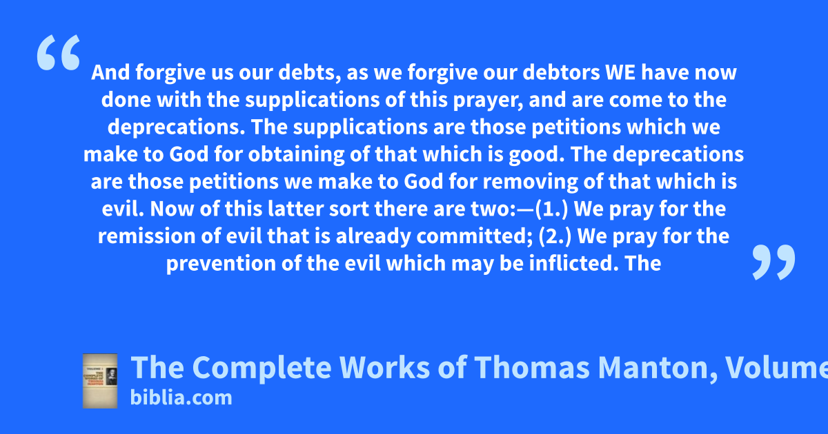 And forgive us our debts, as we forgive our debtors WE have now done with the supplications of this prayer, and are come to the deprecations. The supplications are those petitions which we make to God for obtaining of that which is good. The deprecations are those petitions we make to God for removing of that which is evil. Now of this latter sort there are two:—(1.) We pray for the remission of evil that is already committed; (2.) We pray for the prevention of the evil which may be inflicted. The