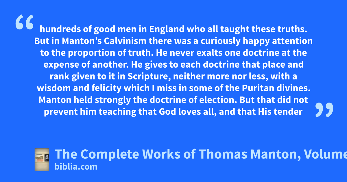 hundreds of good men in England who all taught these truths. But in Manton’s Calvinism there was a curiously happy attention to the proportion of truth. He never exalts one doctrine at the expense of another. He gives to each doctrine that place and rank given to it in Scripture, neither more nor less, with a wisdom and felicity which I miss in some of the Puritan divines. Manton held strongly the doctrine of election. But that did not prevent him teaching that God loves all, and that His tender