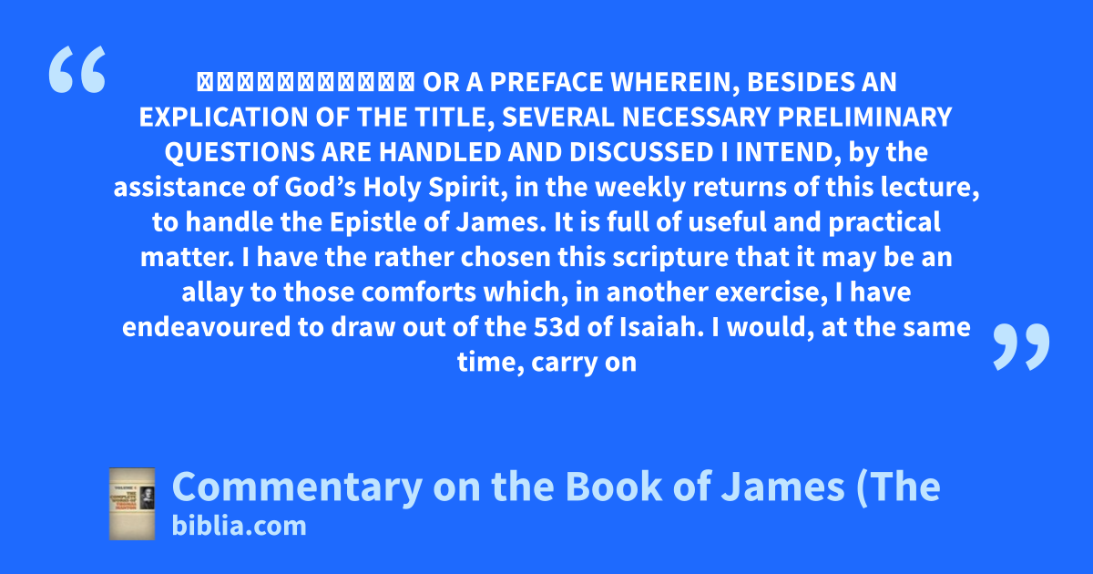 ΠΡΟΛΕΓΌΜΕΝΑ OR A PREFACE WHEREIN, BESIDES AN EXPLICATION OF THE TITLE, SEVERAL NECESSARY PRELIMINARY QUESTIONS ARE HANDLED AND DISCUSSED I INTEND, by the assistance of God’s Holy Spirit, in the weekly returns of this lecture, to handle the Epistle of James. It is full of useful and practical matter. I have the rather chosen this scripture that it may be an allay to those comforts which, in another exercise, I have endeavoured to draw out of the 53d of Isaiah. I would, at the same time, carry on