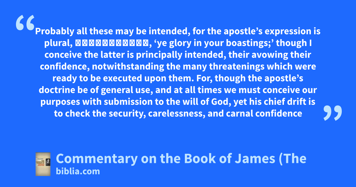 Probably all these may be intended, for the apostle’s expression is plural, ἀλαζονείαις, ‘ye glory in your boastings;’ though I conceive the latter is principally intended, their avowing their confidence, notwithstanding the many threatenings which were ready to be executed upon them. For, though the apostle’s doctrine be of general use, and at all times we must conceive our purposes with submission to the will of God, yet his chief drift is to check the security, carelessness, and carnal confidence