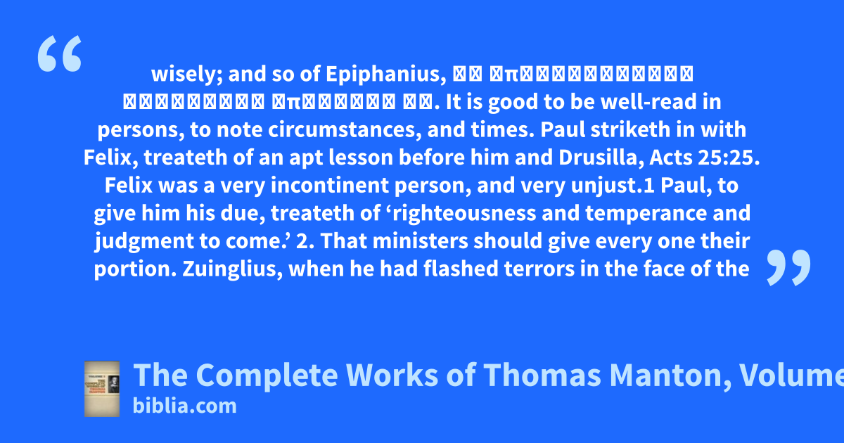wisely; and so of Epiphanius, δἰ ὑπερβάλλουσαν εὐλάβειαν ἁπλόϊκος ῶν. It is good to be well-read in persons, to note circumstances, and times. Paul striketh in with Felix, treateth of an apt lesson before him and Drusilla, Acts 25:25. Felix was a very incontinent person, and very unjust.1 Paul, to give him his due, treateth of ‘righteousness and temperance and judgment to come.’ 2. That ministers should give every one their portion. Zuinglius, when he had flashed terrors in the face of the