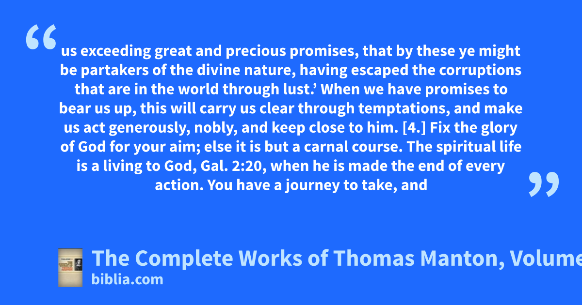 us exceeding great and precious promises, that by these ye might be partakers of the divine nature, having escaped the corruptions that are in the world through lust.’ When we have promises to bear us up, this will carry us clear through temptations, and make us act generously, nobly, and keep close to him. [4.] Fix the glory of God for your aim; else it is but a carnal course. The spiritual life is a living to God, Gal. 2:20, when he is made the end of every action. You have a journey to take, and
