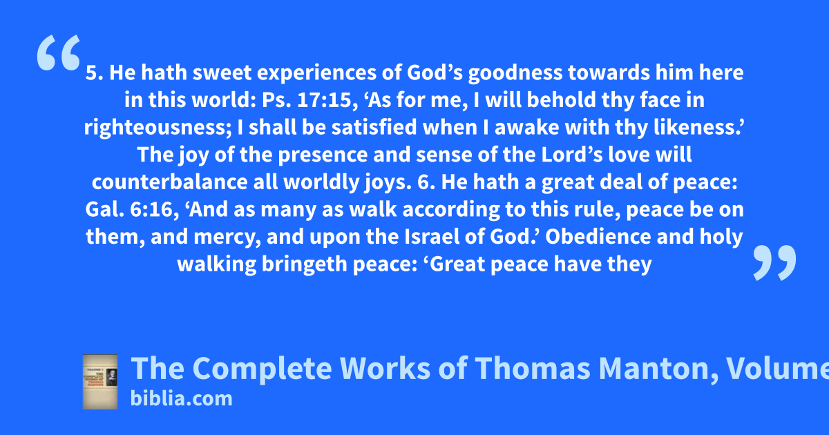5. He hath sweet experiences of God’s goodness towards him here in this world: Ps. 17:15, ‘As for me, I will behold thy face in righteousness; I shall be satisfied when I awake with thy likeness.’ The joy of the presence and sense of the Lord’s love will counterbalance all worldly joys. 6. He hath a great deal of peace: Gal. 6:16, ‘And as many as walk according to this rule, peace be on them, and mercy, and upon the Israel of God.’ Obedience and holy walking bringeth peace: ‘Great peace have they