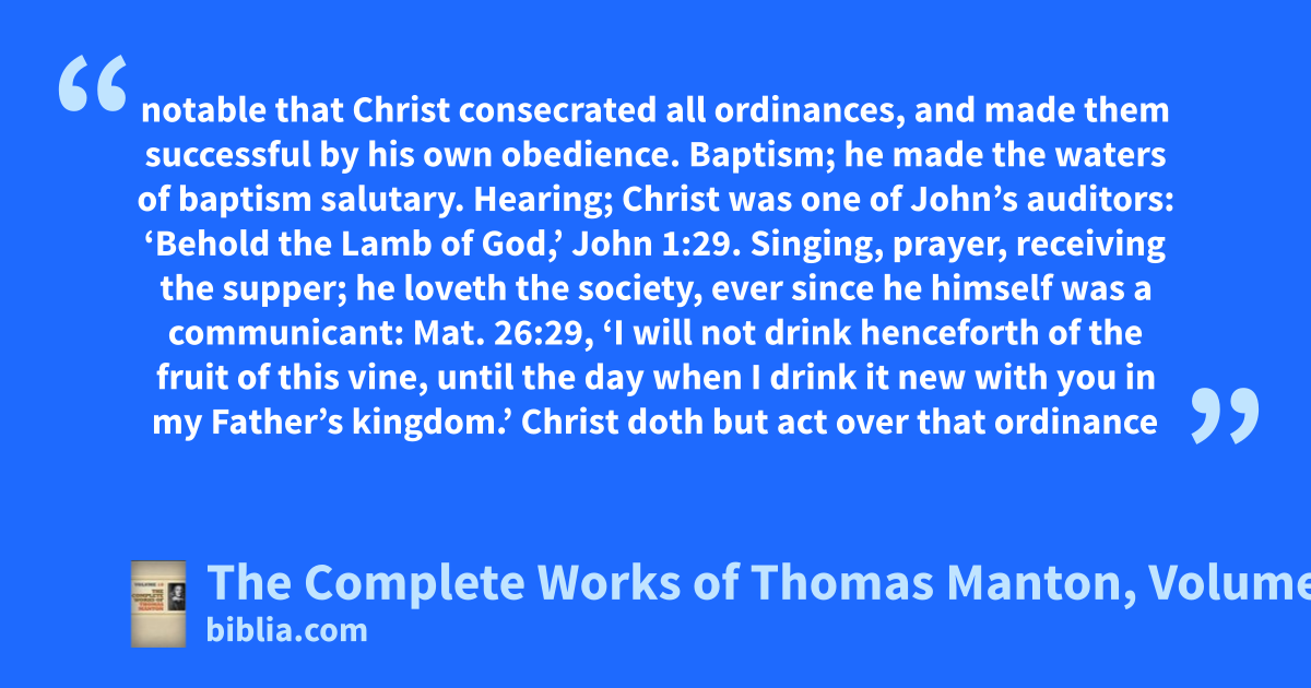notable that Christ consecrated all ordinances, and made them successful by his own obedience. Baptism; he made the waters of baptism salutary. Hearing; Christ was one of John’s auditors: ‘Behold the Lamb of God,’ John 1:29. Singing, prayer, receiving the supper; he loveth the society, ever since he himself was a communicant: Mat. 26:29, ‘I will not drink henceforth of the fruit of this vine, until the day when I drink it new with you in my Father’s kingdom.’ Christ doth but act over that ordinance