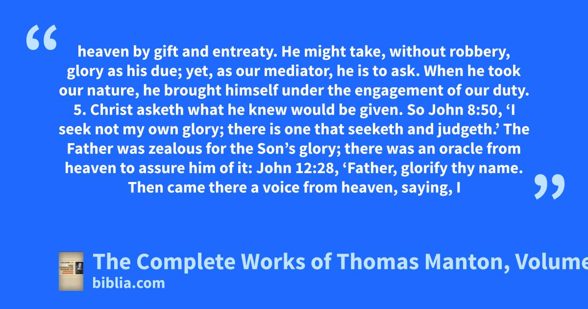 heaven by gift and entreaty. He might take, without robbery, glory as his due; yet, as our mediator, he is to ask. When he took our nature, he brought himself under the engagement of our duty. 5. Christ asketh what he knew would be given. So John 8:50, ‘I seek not my own glory; there is one that seeketh and judgeth.’ The Father was zealous for the Son’s glory; there was an oracle from heaven to assure him of it: John 12:28, ‘Father, glorify thy name. Then came there a voice from heaven, saying, I