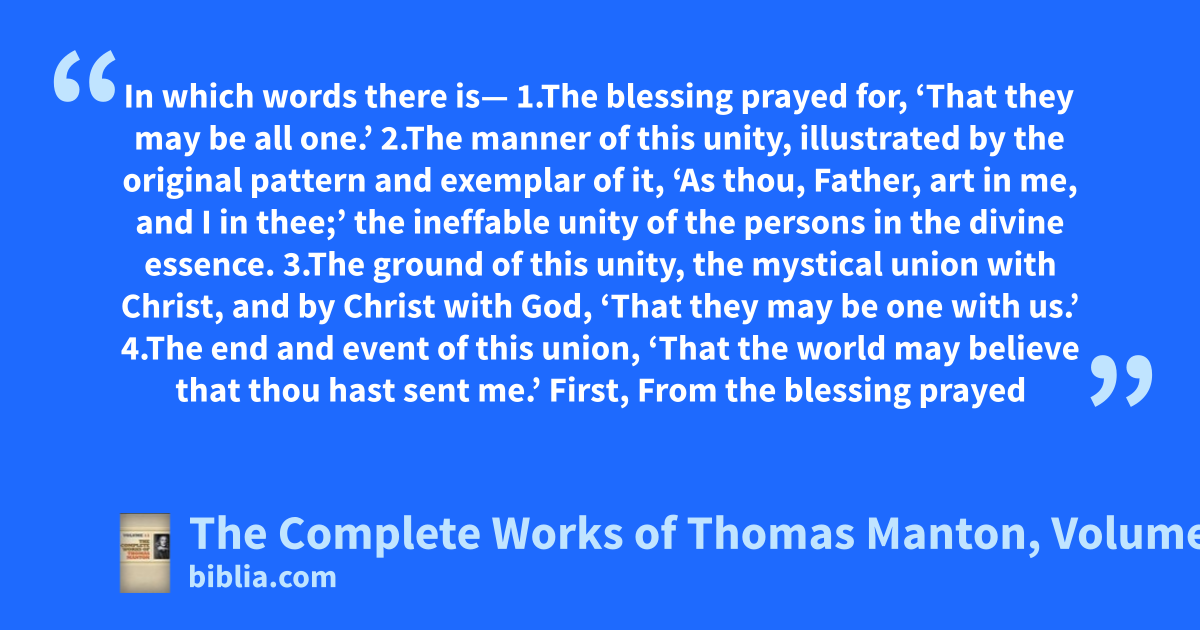 In which words there is— 1.The blessing prayed for, ‘That they may be all one.’ 2.The manner of this unity, illustrated by the original pattern and exemplar of it, ‘As thou, Father, art in me, and I in thee;’ the ineffable unity of the persons in the divine essence. 3.The ground of this unity, the mystical union with Christ, and by Christ with God, ‘That they may be one with us.’ 4.The end and event of this union, ‘That the world may believe that thou hast sent me.’ First, From the blessing prayed