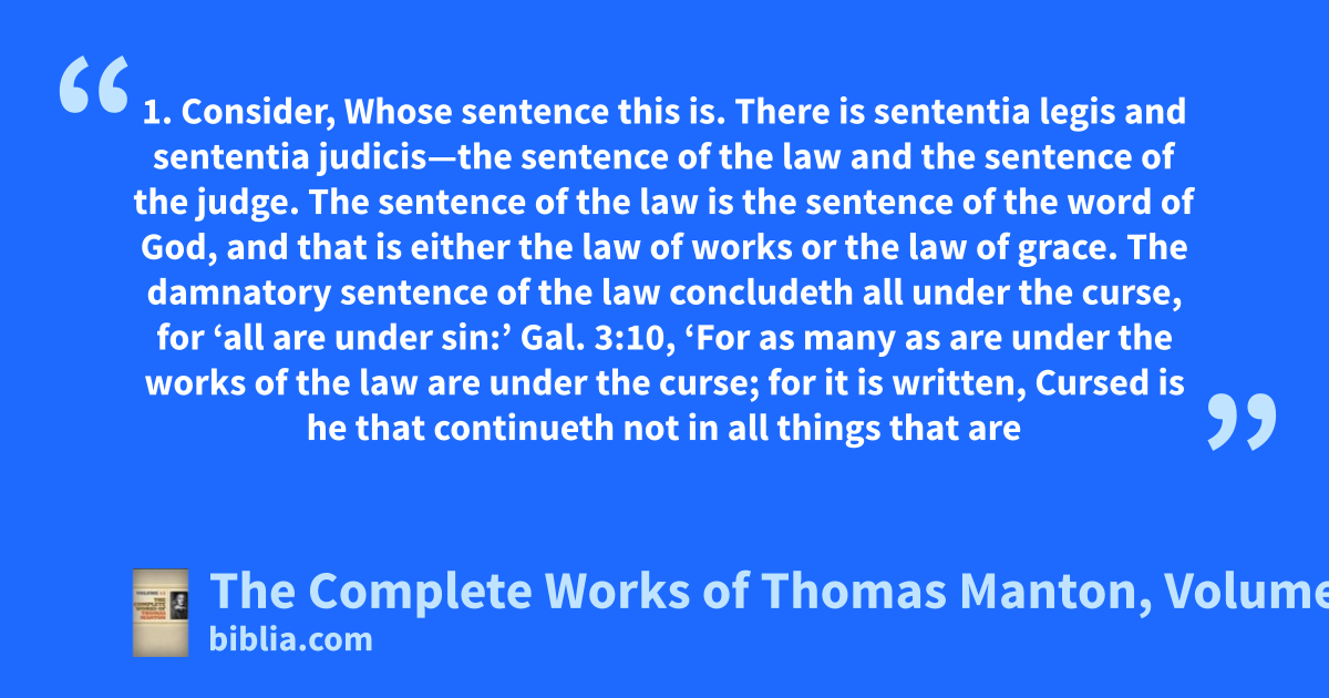 1. Consider, Whose sentence this is. There is sententia legis and sententia judicis—the sentence of the law and the sentence of the judge. The sentence of the law is the sentence of the word of God, and that is either the law of works or the law of grace. The damnatory sentence of the law concludeth all under the curse, for ‘all are under sin:’ Gal. 3:10, ‘For as many as are under the works of the law are under the curse; for it is written, Cursed is he that continueth not in all things that are