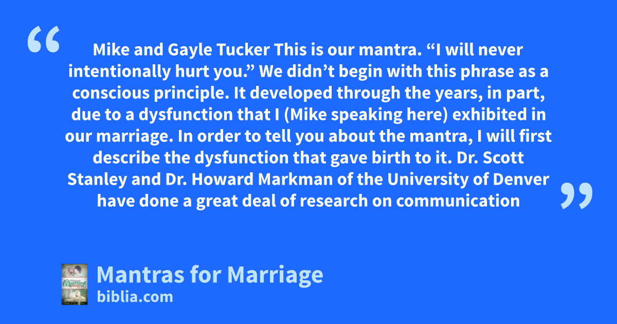 Mike and Gayle Tucker This is our mantra. “I will never intentionally hurt you.” We didn’t begin with this phrase as a conscious principle. It developed through the years, in part, due to a dysfunction that I (Mike speaking here) exhibited in our marriage. In order to tell you about the mantra, I will first describe the dysfunction that gave birth to it. Dr. Scott Stanley and Dr. Howard Markman of the University of Denver have done a great deal of research on communication