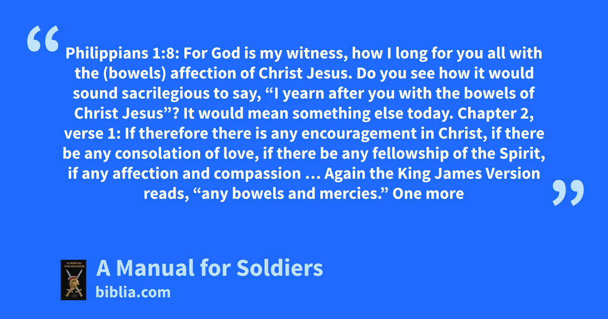 Philippians 1:8: For God is my witness, how I long for you all with the (bowels) affection of Christ Jesus. Do you see how it would sound sacrilegious to say, “I yearn after you with the bowels of Christ Jesus”? It would mean something else today. Chapter 2, verse 1: If therefore there is any encouragement in Christ, if there be any consolation of love, if there be any fellowship of the Spirit, if any affection and compassion … Again the King James Version reads, “any bowels and mercies.” One more