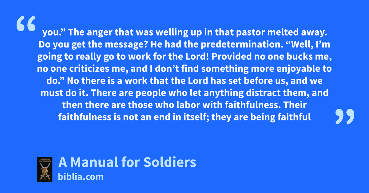 you.” The anger that was welling up in that pastor melted away. Do you get the message? He had the predetermination. “Well, I’m going to really go to work for the Lord! Provided no one bucks me, no one criticizes me, and I don’t find something more enjoyable to do.” No there is a work that the Lord has set before us, and we must do it. There are people who let anything distract them, and then there are those who labor with faithfulness. Their faithfulness is not an end in itself; they are being faithful