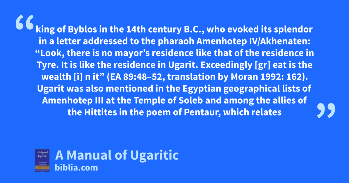 king of Byblos in the 14th century B.C., who evoked its splendor in a letter addressed to the pharaoh Amenhotep IV/Akhenaten: “Look, there is no mayor’s residence like that of the residence in Tyre. It is like the residence in Ugarit. Exceedingly [gr] eat is the wealth [i] n it” (EA 89:48–52, translation by Moran 1992: 162). Ugarit was also mentioned in the Egyptian geographical lists of Amenhotep III at the Temple of Soleb and among the allies of the Hittites in the poem of Pentaur, which relates