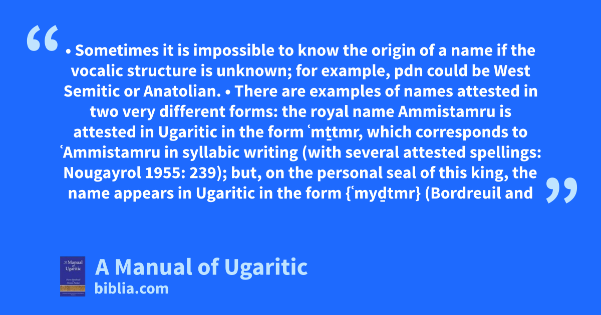 • Sometimes it is impossible to know the origin of a name if the vocalic structure is unknown; for example, pdn could be West Semitic or Anatolian. • There are examples of names attested in two very different forms: the royal name Ammistamru is attested in Ugaritic in the form ʿmṯtmr, which corresponds to ʿAmmistamru in syllabic writing (with several attested spellings: Nougayrol 1955: 239); but, on the personal seal of this king, the name appears in Ugaritic in the form {ʿmyḏtmr} (Bordreuil and