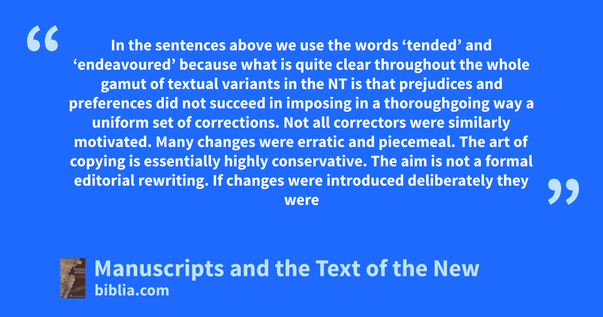 In the sentences above we use the words ‘tended’ and ‘endeavoured’ because what is quite clear throughout the whole gamut of textual variants in the NT is that prejudices and preferences did not succeed in imposing in a thoroughgoing way a uniform set of corrections. Not all correctors were similarly motivated. Many changes were erratic and piecemeal. The art of copying is essentially highly conservative. The aim is not a formal editorial rewriting. If changes were introduced deliberately they were