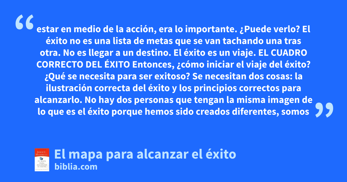 estar en medio de la acción, era lo importante. ¿Puede verlo? El éxito no es una lista de metas que se van tachando una tras otra. No es llegar a un destino. El éxito es un viaje. EL CUADRO CORRECTO DEL ÉXITO Entonces, ¿cómo iniciar el viaje del éxito? ¿Qué se necesita para ser exitoso? Se necesitan dos cosas: la ilustración correcta del éxito y los principios correctos para alcanzarlo. No hay dos personas que tengan la misma imagen de lo que es el éxito porque hemos sido creados diferentes, somos