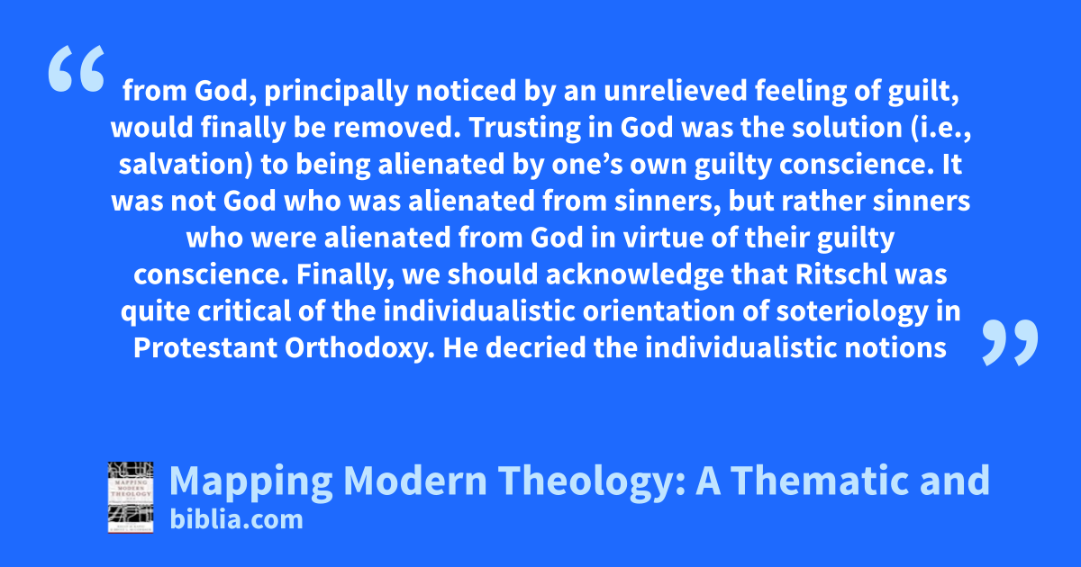 from God, principally noticed by an unrelieved feeling of guilt, would finally be removed. Trusting in God was the solution (i.e., salvation) to being alienated by one’s own guilty conscience. It was not God who was alienated from sinners, but rather sinners who were alienated from God in virtue of their guilty conscience. Finally, we should acknowledge that Ritschl was quite critical of the individualistic orientation of soteriology in Protestant Orthodoxy. He decried the individualistic notions