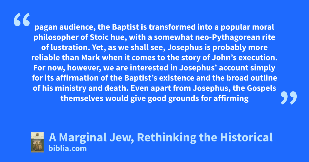pagan audience, the Baptist is transformed into a popular moral philosopher of Stoic hue, with a somewhat neo-Pythagorean rite of lustration. Yet, as we shall see, Josephus is probably more reliable than Mark when it comes to the story of John’s execution. For now, however, we are interested in Josephus’ account simply for its affirmation of the Baptist’s existence and the broad outline of his ministry and death. Even apart from Josephus, the Gospels themselves would give good grounds for affirming