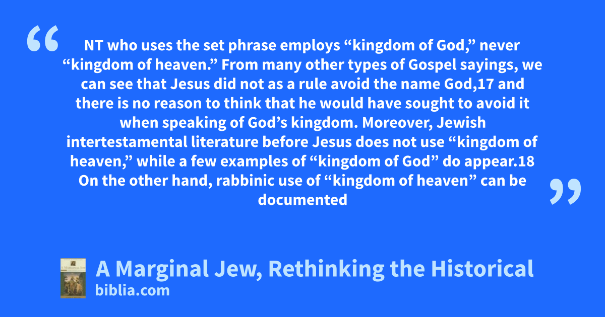 NT who uses the set phrase employs “kingdom of God,” never “kingdom of heaven.” From many other types of Gospel sayings, we can see that Jesus did not as a rule avoid the name God,17 and there is no reason to think that he would have sought to avoid it when speaking of God’s kingdom. Moreover, Jewish intertestamental literature before Jesus does not use “kingdom of heaven,” while a few examples of “kingdom of God” do appear.18 On the other hand, rabbinic use of “kingdom of heaven” can be documented