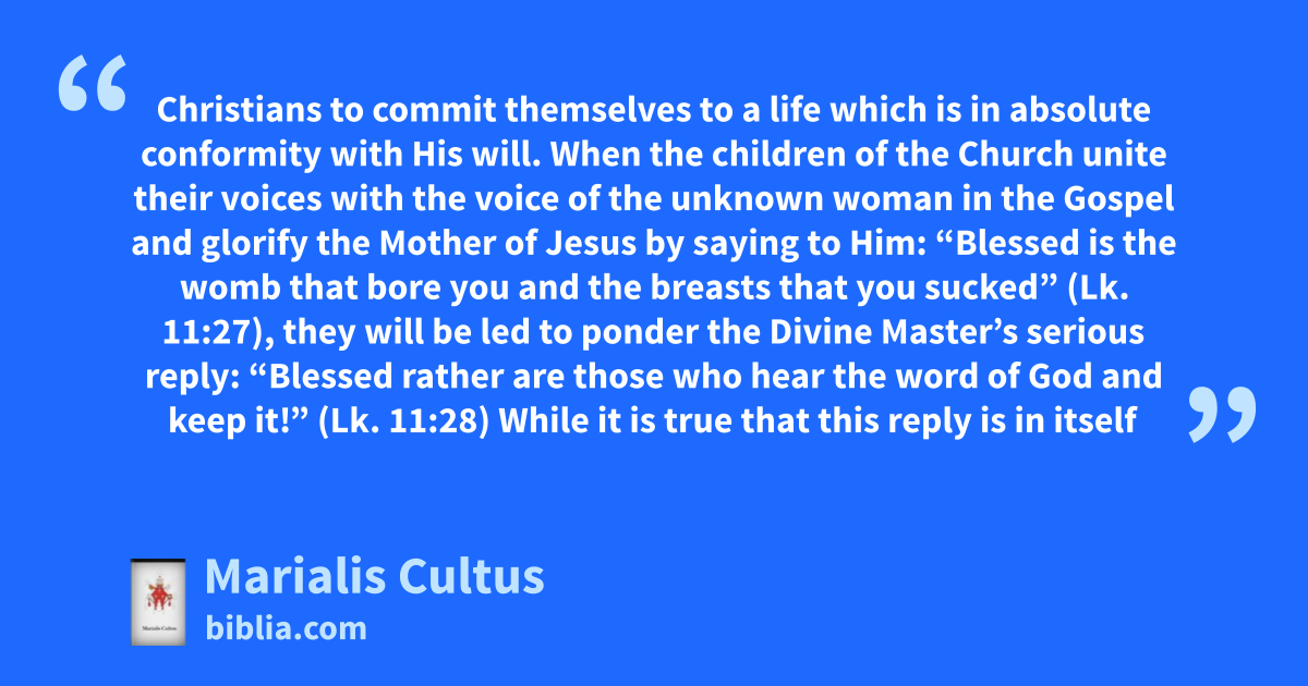 Christians to commit themselves to a life which is in absolute conformity with His will. When the children of the Church unite their voices with the voice of the unknown woman in the Gospel and glorify the Mother of Jesus by saying to Him: “Blessed is the womb that bore you and the breasts that you sucked” (Lk. 11:27), they will be led to ponder the Divine Master’s serious reply: “Blessed rather are those who hear the word of God and keep it!” (Lk. 11:28) While it is true that this reply is in itself