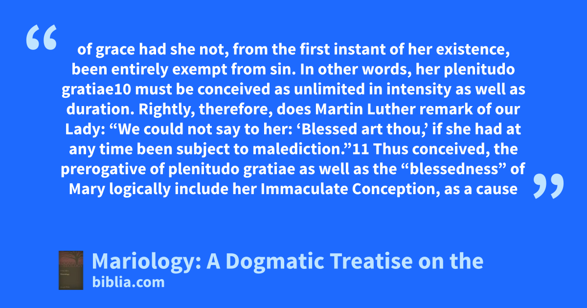 of grace had she not, from the first instant of her existence, been entirely exempt from sin. In other words, her plenitudo gratiae10 must be conceived as unlimited in intensity as well as duration. Rightly, therefore, does Martin Luther remark of our Lady: “We could not say to her: ‘Blessed art thou,’ if she had at any time been subject to malediction.”11 Thus conceived, the prerogative of plenitudo gratiae as well as the “blessedness” of Mary logically include her Immaculate Conception, as a cause