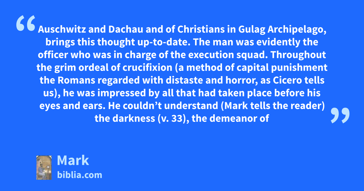 Auschwitz and Dachau and of Christians in Gulag Archipelago, brings this thought up-to-date. The man was evidently the officer who was in charge of the execution squad. Throughout the grim ordeal of crucifixion (a method of capital punishment the Romans regarded with distaste and horror, as Cicero tells us), he was impressed by all that had taken place before his eyes and ears. He couldn’t understand (Mark tells the reader) the darkness (v. 33), the demeanor of