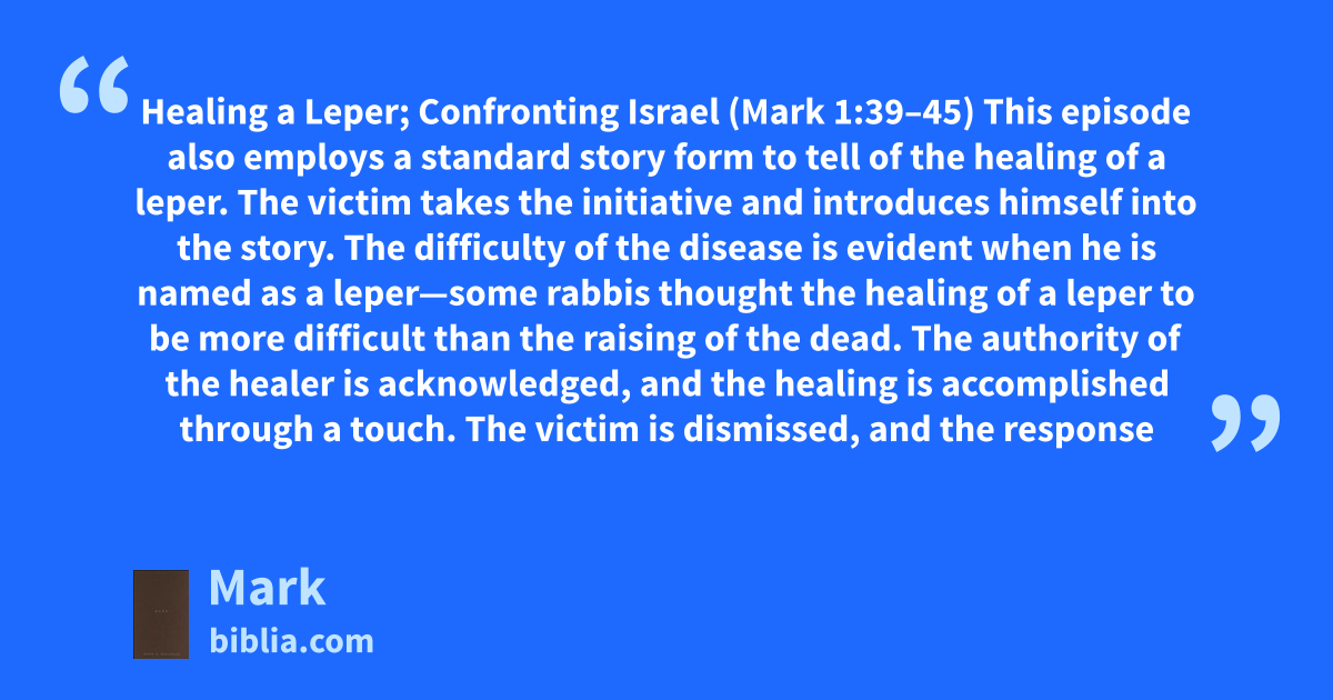 Healing a Leper; Confronting Israel (Mark 1:39–45) This episode also employs a standard story form to tell of the healing of a leper. The victim takes the initiative and introduces himself into the story. The difficulty of the disease is evident when he is named as a leper—some rabbis thought the healing of a leper to be more difficult than the raising of the dead. The authority of the healer is acknowledged, and the healing is accomplished through a touch. The victim is dismissed, and the response