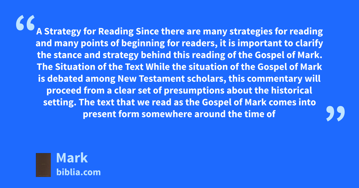 A Strategy for Reading Since there are many strategies for reading and many points of beginning for readers, it is important to clarify the stance and strategy behind this reading of the Gospel of Mark. The Situation of the Text While the situation of the Gospel of Mark is debated among New Testament scholars, this commentary will proceed from a clear set of presumptions about the historical setting. The text that we read as the Gospel of Mark comes into present form somewhere around the time of