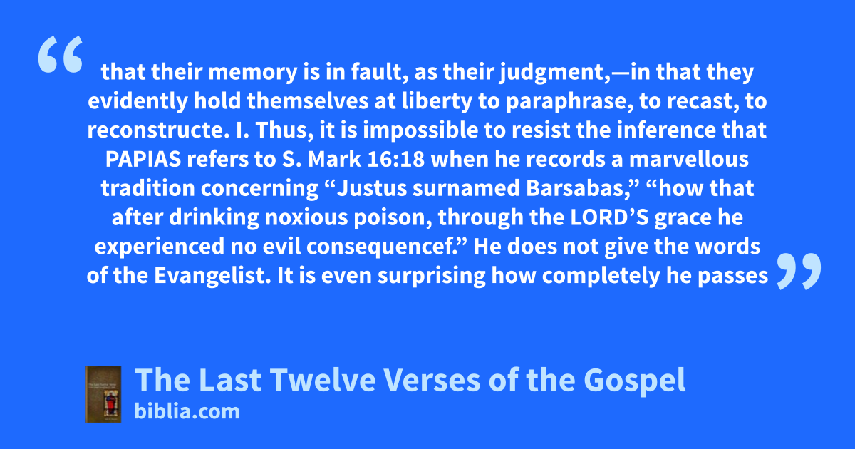 that their memory is in fault, as their judgment,—in that they evidently hold themselves at liberty to paraphrase, to recast, to reconstructe. I. Thus, it is impossible to resist the inference that PAPIAS refers to S. Mark 16:18 when he records a marvellous tradition concerning “Justus surnamed Barsabas,” “how that after drinking noxious poison, through the LORD’S grace he experienced no evil consequencef.” He does not give the words of the Evangelist. It is even surprising how completely he passes