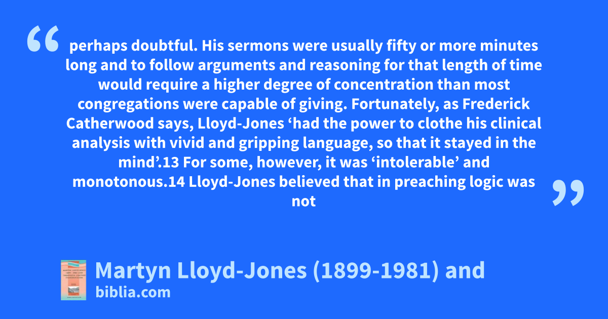 perhaps doubtful. His sermons were usually fifty or more minutes long and to follow arguments and reasoning for that length of time would require a higher degree of concentration than most congregations were capable of giving. Fortunately, as Frederick Catherwood says, Lloyd-Jones ‘had the power to clothe his clinical analysis with vivid and gripping language, so that it stayed in the mind’.13 For some, however, it was ‘intolerable’ and monotonous.14 Lloyd-Jones believed that in preaching logic was not