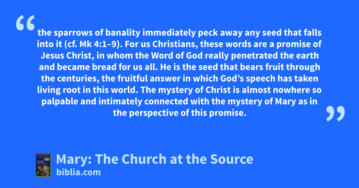 the sparrows of banality immediately peck away any seed that falls into it (cf. Mk 4:1–9). For us Christians, these words are a promise of Jesus Christ, in whom the Word of God really penetrated the earth and became bread for us all. He is the seed that bears fruit through the centuries, the fruitful answer in which God’s speech has taken living root in this world. The mystery of Christ is almost nowhere so palpable and intimately connected with the mystery of Mary as in the perspective of this promise.
