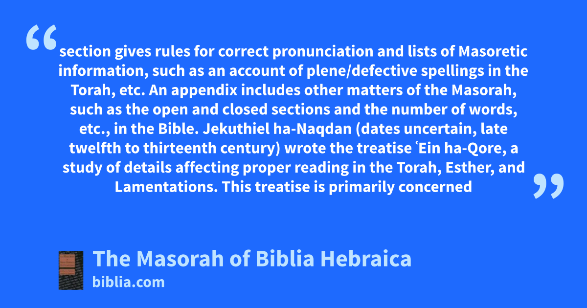 section gives rules for correct pronunciation and lists of Masoretic information, such as an account of plene/defective spellings in the Torah, etc. An appendix includes other matters of the Masorah, such as the open and closed sections and the number of words, etc., in the Bible. Jekuthiel ha-Naqdan (dates uncertain, late twelfth to thirteenth century) wrote the treatise ʿEin ha-Qore, a study of details affecting proper reading in the Torah, Esther, and Lamentations. This treatise is primarily concerned