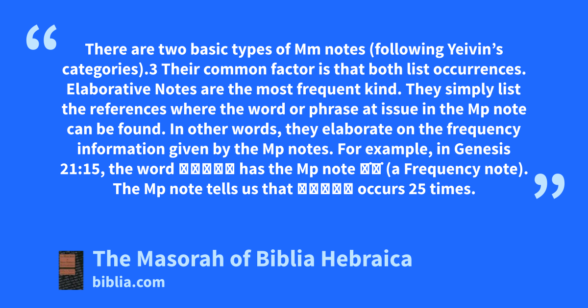 There are two basic types of Mm notes (following Yeivin’s categories).3 Their common factor is that both list occurrences. Elaborative Notes are the most frequent kind. They simply list the references where the word or phrase at issue in the Mp note can be found. In other words, they elaborate on the frequency information given by the Mp notes. For example, in Genesis 21:15, the word אַחַד has the Mp note כ̇ה̇ (a Frequency note). The Mp note tells us that אַחַד occurs 25 times.