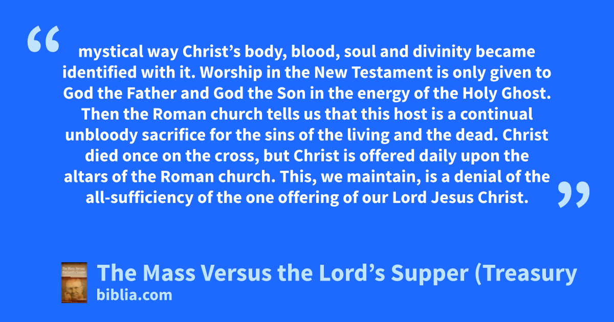 mystical way Christ’s body, blood, soul and divinity became identified with it. Worship in the New Testament is only given to God the Father and God the Son in the energy of the Holy Ghost. Then the Roman church tells us that this host is a continual unbloody sacrifice for the sins of the living and the dead. Christ died once on the cross, but Christ is offered daily upon the altars of the Roman church. This, we maintain, is a denial of the all-sufficiency of the one offering of our Lord Jesus Christ.