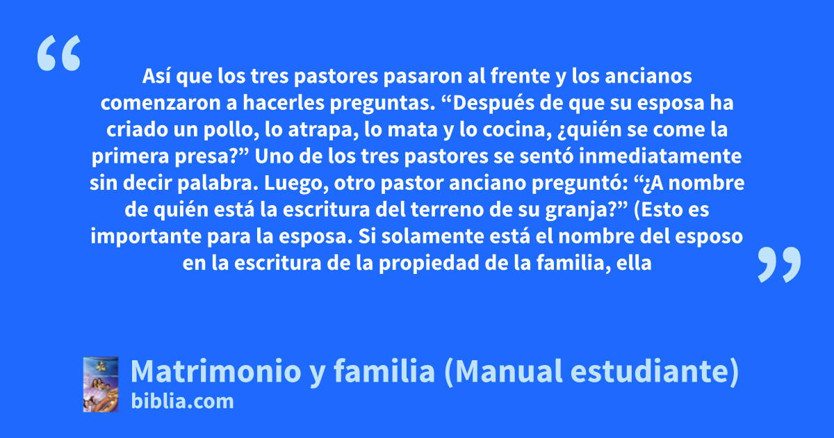 Así que los tres pastores pasaron al frente y los ancianos comenzaron a hacerles preguntas. “Después de que su esposa ha criado un pollo, lo atrapa, lo mata y lo cocina, ¿quién se come la primera presa?” Uno de los tres pastores se sentó inmediatamente sin decir palabra. Luego, otro pastor anciano preguntó: “¿A nombre de quién está la escritura del terreno de su granja?” (Esto es importante para la esposa. Si solamente está el nombre del esposo en la escritura de la propiedad de la familia, ella