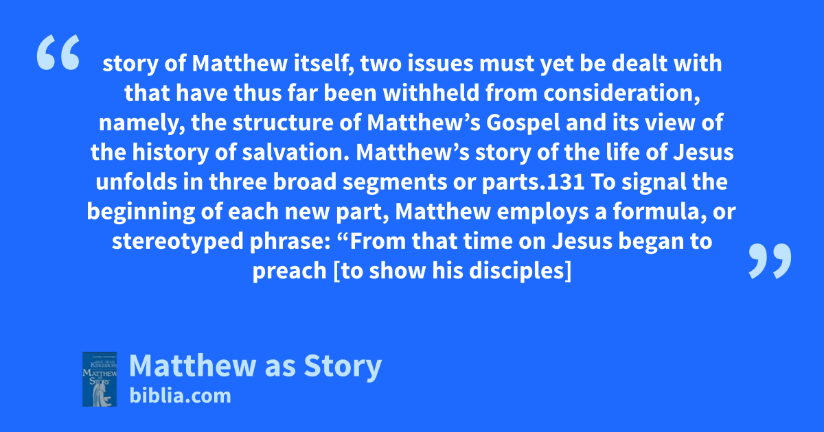story of Matthew itself, two issues must yet be dealt with that have thus far been withheld from consideration, namely, the structure of Matthew’s Gospel and its view of the history of salvation. Matthew’s story of the life of Jesus unfolds in three broad segments or parts.131 To signal the beginning of each new part, Matthew employs a formula, or stereotyped phrase: “From that time on Jesus began to preach [to show his disciples]
