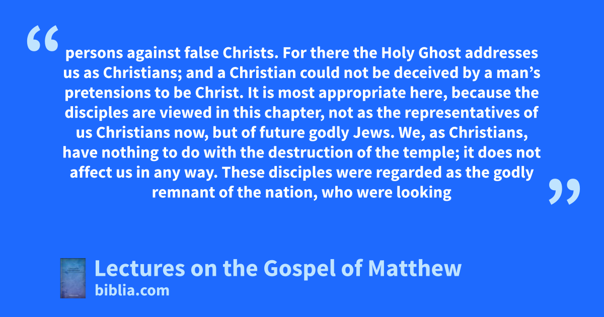 persons against false Christs. For there the Holy Ghost addresses us as Christians; and a Christian could not be deceived by a man’s pretensions to be Christ. It is most appropriate here, because the disciples are viewed in this chapter, not as the representatives of us Christians now, but of future godly Jews. We, as Christians, have nothing to do with the destruction of the temple; it does not affect us in any way. These disciples were regarded as the godly remnant of the nation, who were looking