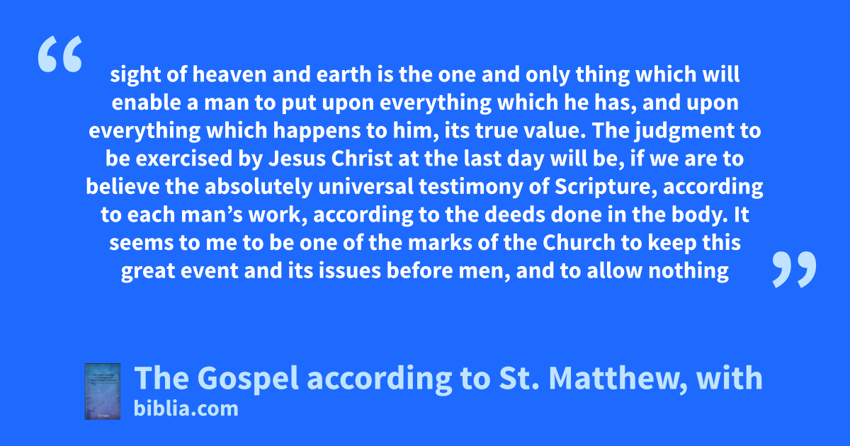 sight of heaven and earth is the one and only thing which will enable a man to put upon everything which he has, and upon everything which happens to him, its true value. The judgment to be exercised by Jesus Christ at the last day will be, if we are to believe the absolutely universal testimony of Scripture, according to each man’s work, according to the deeds done in the body. It seems to me to be one of the marks of the Church to keep this great event and its issues before men, and to allow nothing