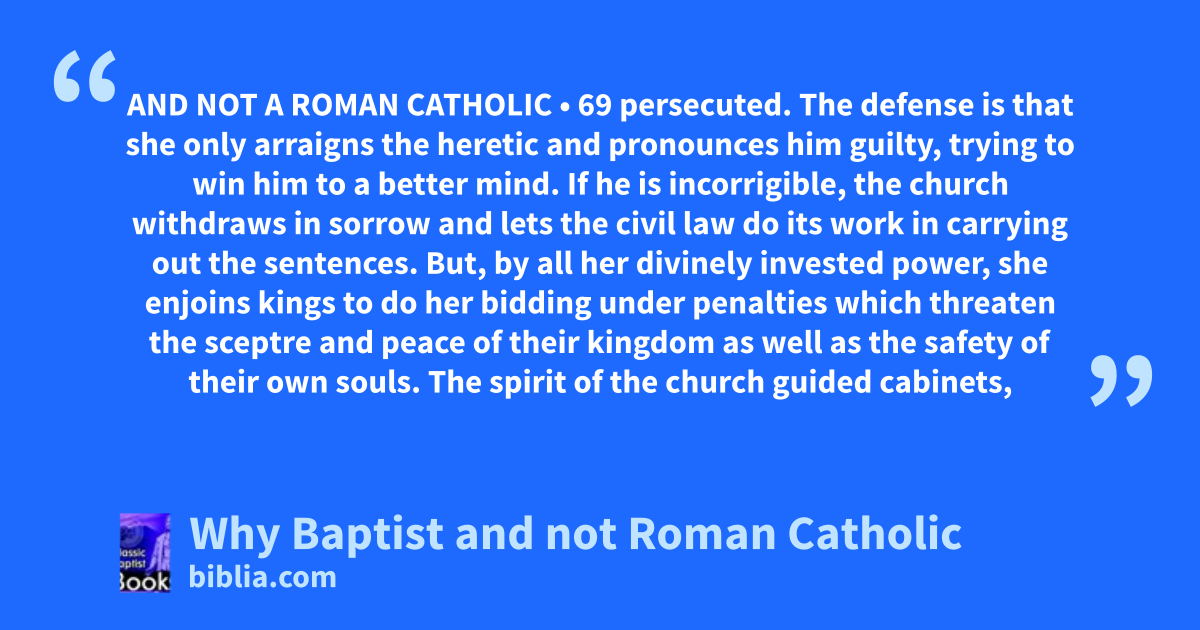 AND NOT A ROMAN CATHOLIC • 69 persecuted. The defense is that she only arraigns the heretic and pronounces him guilty, trying to win him to a better mind. If he is incorrigible, the church withdraws in sorrow and lets the civil law do its work in carrying out the sentences. But, by all her divinely invested power, she enjoins kings to do her bidding under penalties which threaten the sceptre and peace of their kingdom as well as the safety of their own souls. The spirit of the church guided cabinets,
