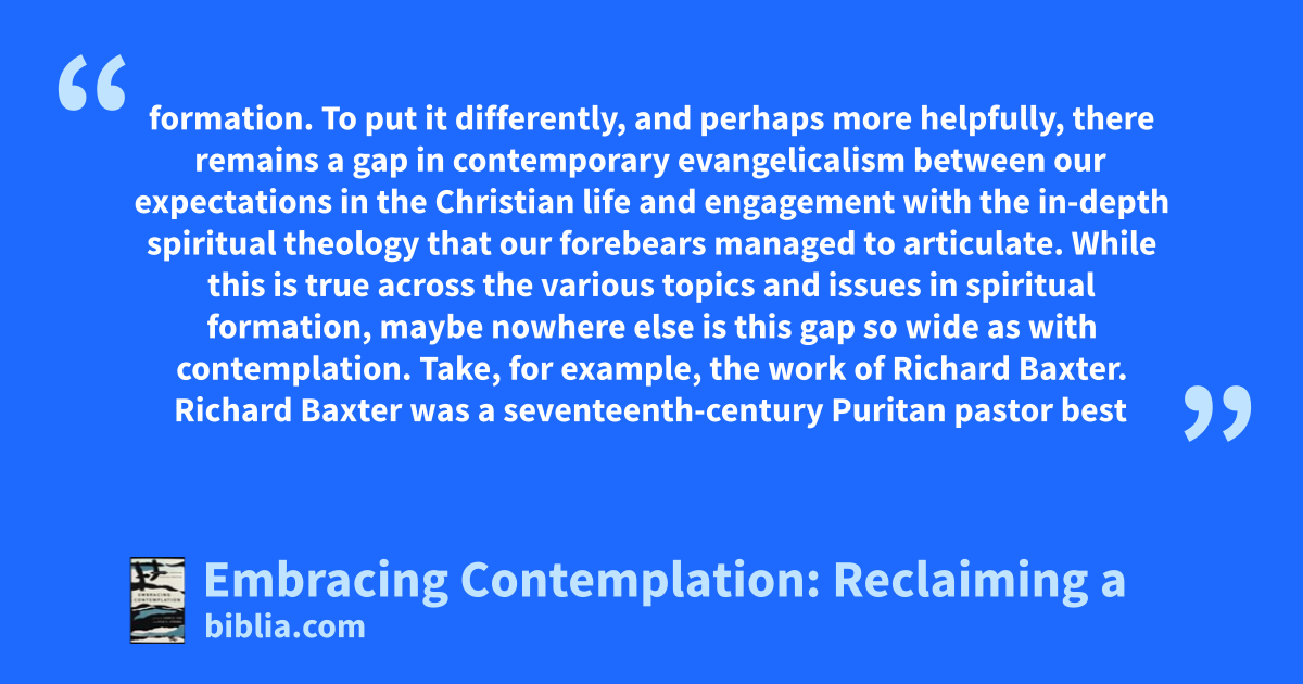formation. To put it differently, and perhaps more helpfully, there remains a gap in contemporary evangelicalism between our expectations in the Christian life and engagement with the in-depth spiritual theology that our forebears managed to articulate. While this is true across the various topics and issues in spiritual formation, maybe nowhere else is this gap so wide as with contemplation. Take, for example, the work of Richard Baxter. Richard Baxter was a seventeenth-century Puritan pastor best