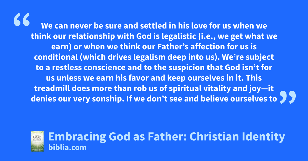 We can never be sure and settled in his love for us when we think our relationship with God is legalistic (i.e., we get what we earn) or when we think our Father’s affection for us is conditional (which drives legalism deep into us). We’re subject to a restless conscience and to the suspicion that God isn’t for us unless we earn his favor and keep ourselves in it. This treadmill does more than rob us of spiritual vitality and joy—it denies our very sonship. If we don’t see and believe ourselves to