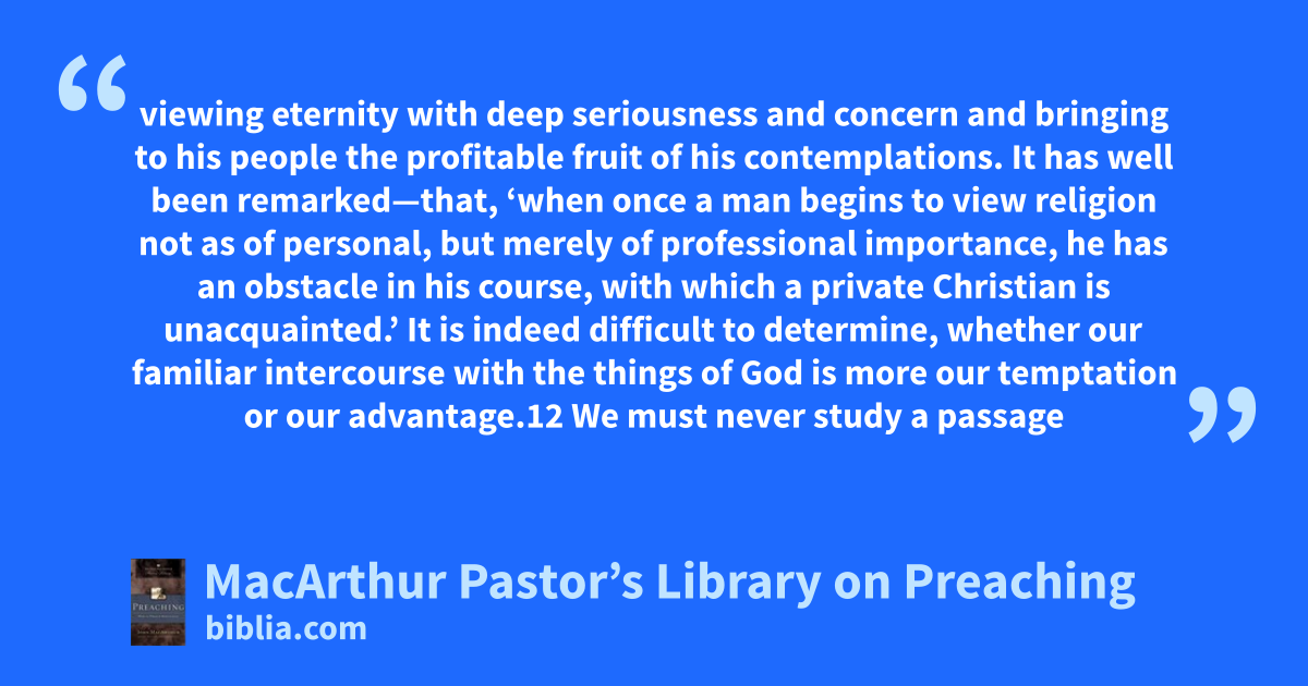 viewing eternity with deep seriousness and concern and bringing to his people the profitable fruit of his contemplations. It has well been remarked—that, ‘when once a man begins to view religion not as of personal, but merely of professional importance, he has an obstacle in his course, with which a private Christian is unacquainted.’ It is indeed difficult to determine, whether our familiar intercourse with the things of God is more our temptation or our advantage.12 We must never study a passage